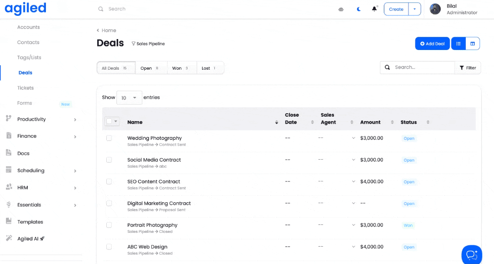Bulk Actions:Â Manage multiple deals simultaneously.
